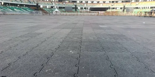 Ainsi, dans la perspective d'accueillir du public sur l'espace de la pelouse, des plaques de protection ont été installées sur toute la surface du terrain.