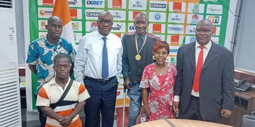 . À la fin de l'audience le président de la FIF a bien voulu poser pour la postérité avec l'ONG le trophée de la coupe d'Afrique des Nations 2023 remporté par les Éléphants de Côte d'Ivoire dans une joie indescriptible. l'ONG Espoir Handicap a dit un grand merci au président de la FIF ainsi qu'à toute son équipe dirigeante