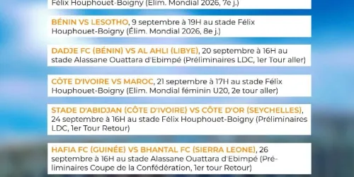 Après ces deux journées des éliminatoires de la coupe du monde, place sera faite à partir du 20 septembre aux compétitions inter clubs de la CAF. Ainsi l'équipe du Dadjé fc du Bénin pour le premier tour de la ligue africaine des champions fera face à son homologue de Lybie Al Ahli au stade olympique Alassane Ouattara d'Ebimpé à 16 heures. Sans oublier que la Côte d'Ivoire recevra le 21 septembre à 17 heures au stade Félix Houphouet Boigny le Maroc dans le cadre des éliminatoires de la coupe du monde féminine U 20 match aller. Le 24 septembre le champion de Côte d'Ivoire, le stade d'Abidjan accueille les Seychellois de Côte d'or à 16 heures au stade Félix Houphouet Boigny . Le 26 septembre les Guinéens du Hafia fc feront face à Banthal FC de la Sierra Leone pour les préliminaires de la coupe de la confédération à 16 heures au stade olympique Alassane Ouattara d'Ebimpé. Le lendemain le 27 septembre dans la même enceinte à 16 heures l'AFAD du plateau l'autre représentant ivoirien en coupe de la confédération croise le fer avec les Sénégalais de Génération Foot. Le deuxième représentant ivoirien dans la même compétition, le FC San Pedro à 16 heures toujours ce 27 septembre au stade Laurent Pokou de San Pedro sera face aux Camerounais de Aigle Royal Menoula. Enfin l'ASEC mimosas en ligue africaine des champions pour le retour sera aux prises au Power Dynamo de la Zambie au stade Félix Houphouet Boigny à 16 heures .
