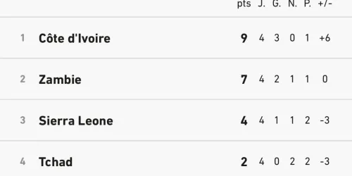 La Côte d'Ivoire toujours en tête de sa poule avec 09 points, suivi de la Zambie 07 points.